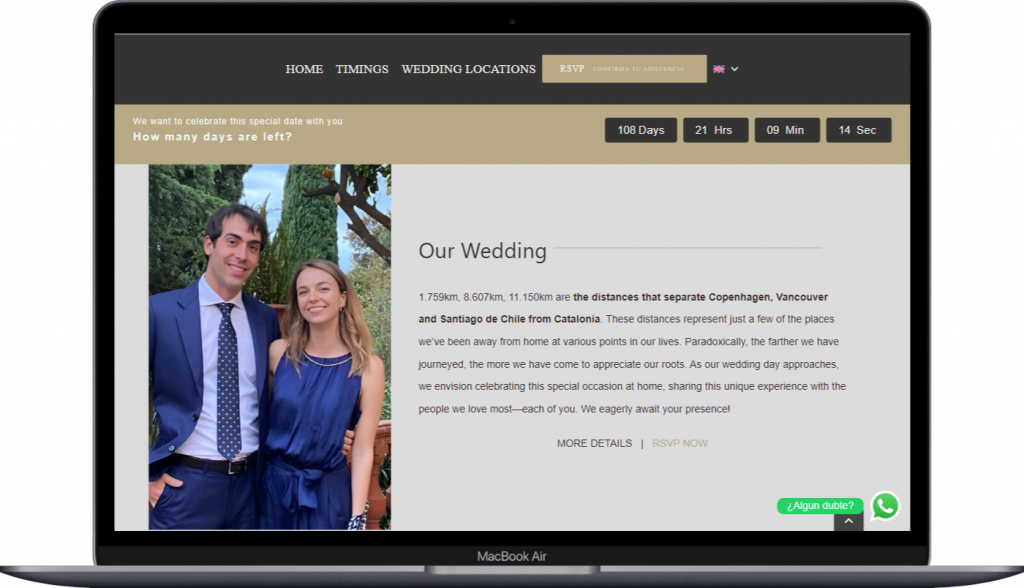 El objetivo principal fue crear una página cálida, visual y emocional para anunciar su nueva etapa juntos. Además, se implementó un diseño responsive compatible con móviles y tablets, facilitando la navegación multilingüe mediante WPML y optimizando la velocidad y accesibilidad para garantizar una experiencia de usuario fluida.